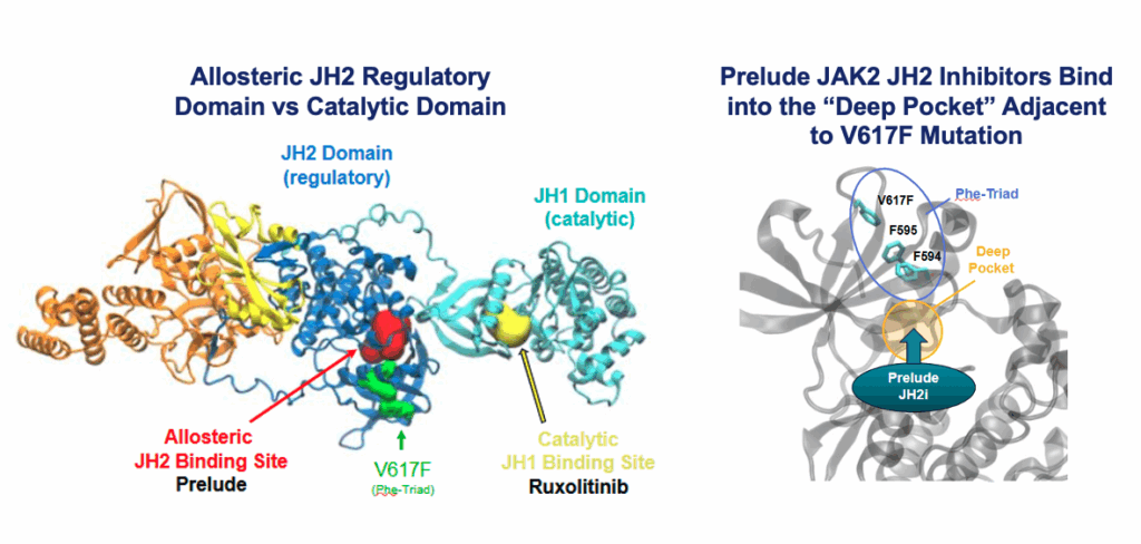 Prelude has discovered novel allosteric inhibitors that bind into the JAK2 JH2 “deep pocket” where the V617F mutation resides. These candidates demonstrate mutant specific inhibition in multiple preclinical models of MPNs. This program is the subject of an exclusive option agreement with Incyte.